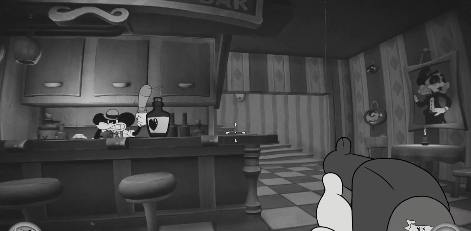 Mouse: P.I. for Hire é exatamente o que parece: um FPS (first-person shooter, jogo de tiro em primeira pessoa) com estética de animação rubberhose dos anos 1930 — aquele estilo de personagens com membros elásticos e olhos circulares que remetem aos cartoons de Betty Boop e Felix the Cat — aplicada a um game de tiro frenético e violento. 🐭