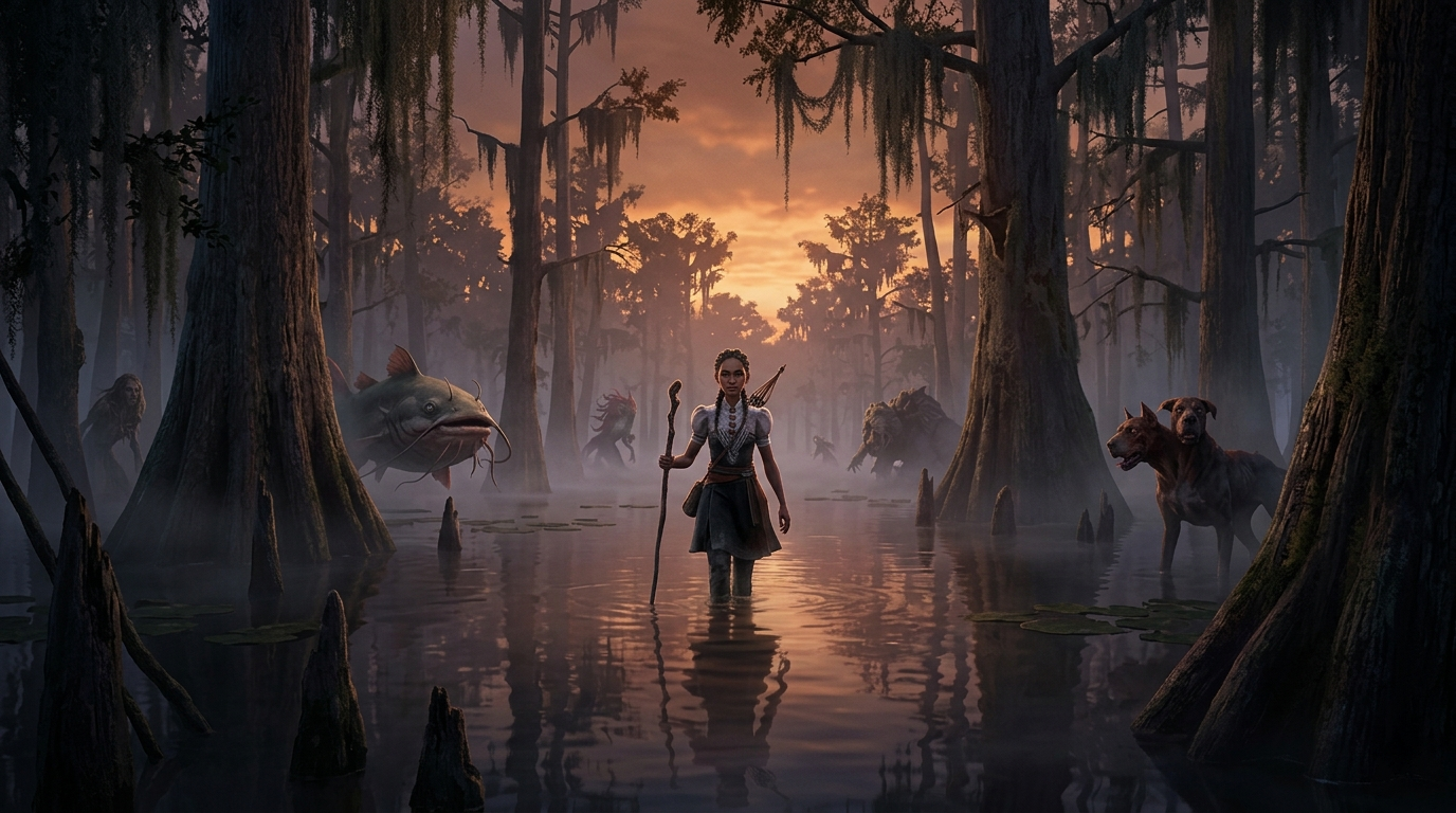 Ao descobrir que é uma Tecelã (Weaver) — uma protetora mágica capaz de ver e manipular fios etéreos chamados Strands —, Hazel parte numa jornada de 14 capítulos para resgatar sua mãe e curar as feridas espirituais do mundo ao redor. Os inimigos do jogo se chamam Haints: seres que um dia foram humanos, cada um baseado em uma lenda real do folclore sulista americano, como o assustador Rougarou (o lobisomem do bayou) e a Huggin' Molly, figura que aterroriza crianças nas histórias do Alabama. 🐊