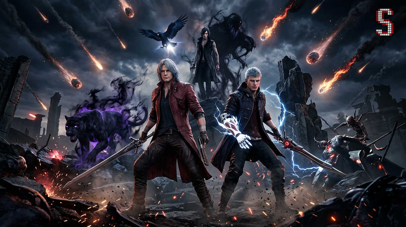O retorno de DMC5 foi o ponto de virada que mostrou ao mundo que a Capcom estava de volta para valer. Três personagens jogáveis com estilos completamente diferentes, combate que recompensa criatividade e estilo, uma narrativa que serviu de redenção para Dante e Nero depois do período confuso da série — e visualmente deslumbrante para a época.